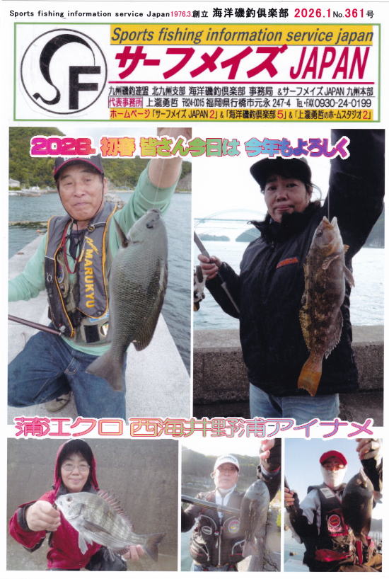 | 2025.11.月.5月末、長崎県対馬へ弟、哲ちゃんと三泊4日でシロキス31.5㎝、30.5㎝を釣りました。上県町志多留港のシロアマダイ51㎝は私。洋子ちゃんは58㎝を4月28日釣りました。2024.11月17日、MFG九州グレ釣り選手権が佐伯であり私達参加しました。そしてMFG九州チヌ釣り選手権4月28日では洋子ちゃんと大道さんで、蒲江のクロ、入れ食いの中で洋子ちゃんイシダイ35㎝釣り検寸。しかし参加119人他魚4位、入賞外でした。それでも参加費1000円で参加賞に抽選会は全員当るもので、ジャンケン大会までして、皆さんとコミュニケーションでき楽しかったですね。そして大分県蒲江の波止釣りクロが絶好調。その後、洋子ちゃんがチヌ54㎝西野浦で釣りました。米水津宮野浦ではマダイにクロ、スズキも釣れた私。仲間達も同等に色んな魚釣れています。投げ釣りは大入島でカレイにキス。長崎県鷹島でメバル、オオモンハタにカサゴが足元で釣れます。季節に合わせた釣り、大切です。詳しくは機関紙サーフメイズJAPANご覧下さい。さて新しいウインドーズ10からホームページヒルダー22より新しいイメージで更新中。お手紙でメッセージなど頂けたら嬉しいです。 なをポイント苅田店が行橋バイパスに移転し、行橋店になりました。機関紙サーフメイズJAPANを玄関に置いていますので自由にお持ち帰り下さいゴミ袋付き。 海洋磯釣俱楽部 事務局 〒824-0015 福岡県行橋市元永247-4 電話 0930-24-0199 fax 0930-24-0199